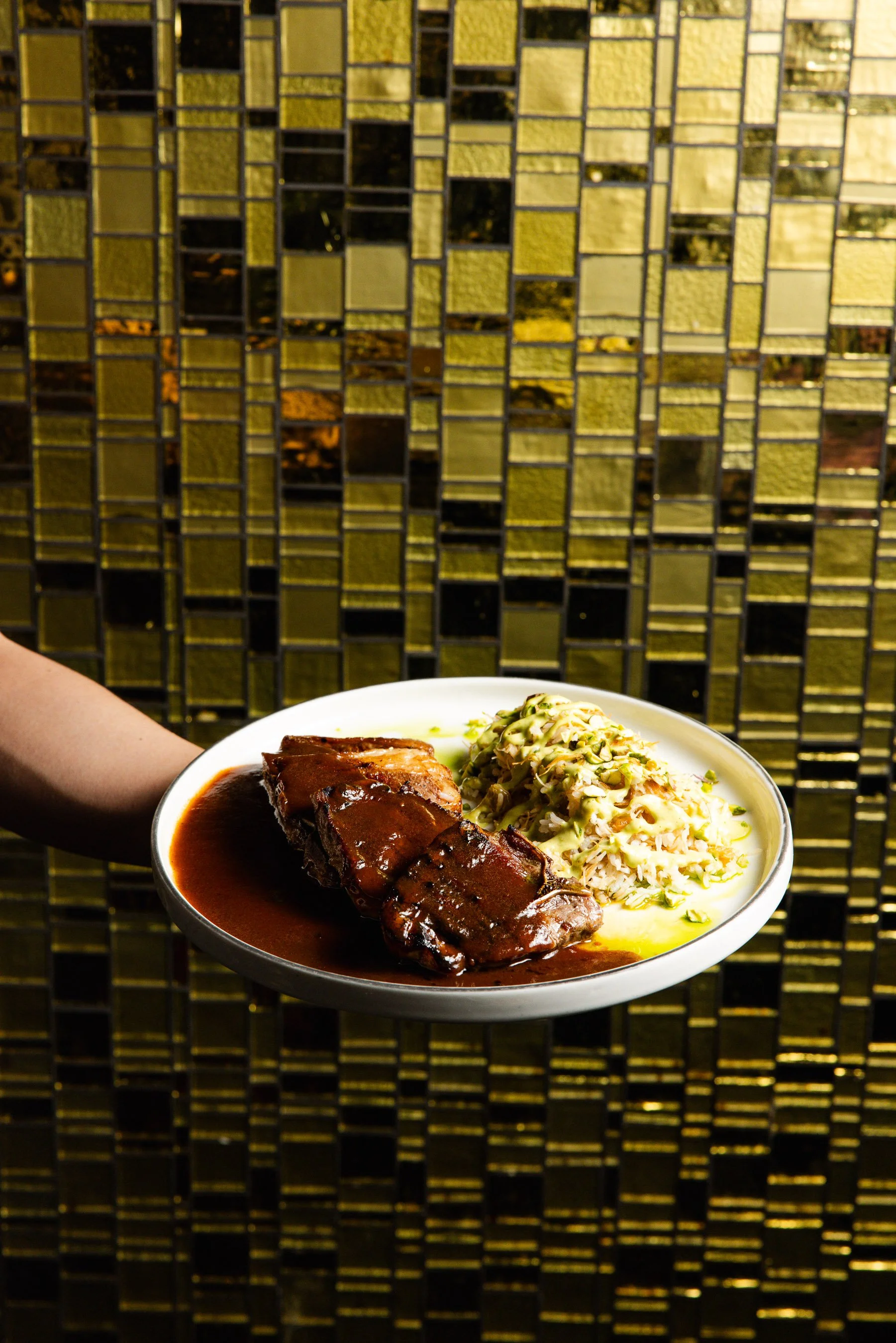 Glazed shoulder chops, pistachio & raisin labneh, Lebanese rice, lamb jus (GF) (DFO)