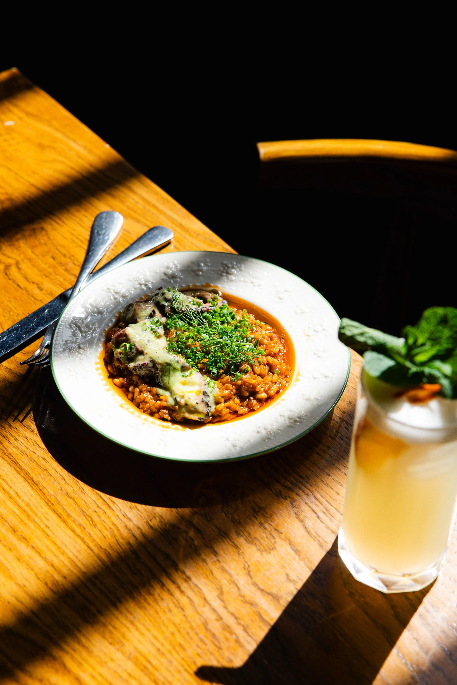 grilled octopus in roasted pineapple tiger milk, bisque & Pernod risotto, chives, herb oil (GF)