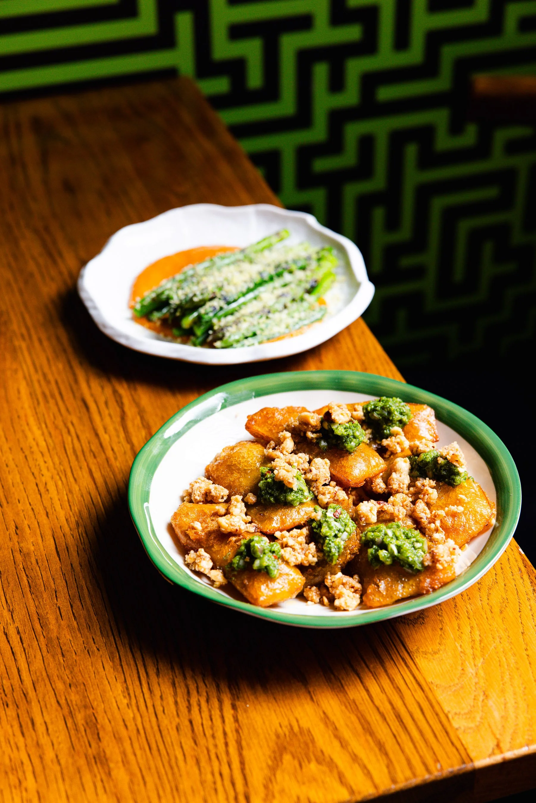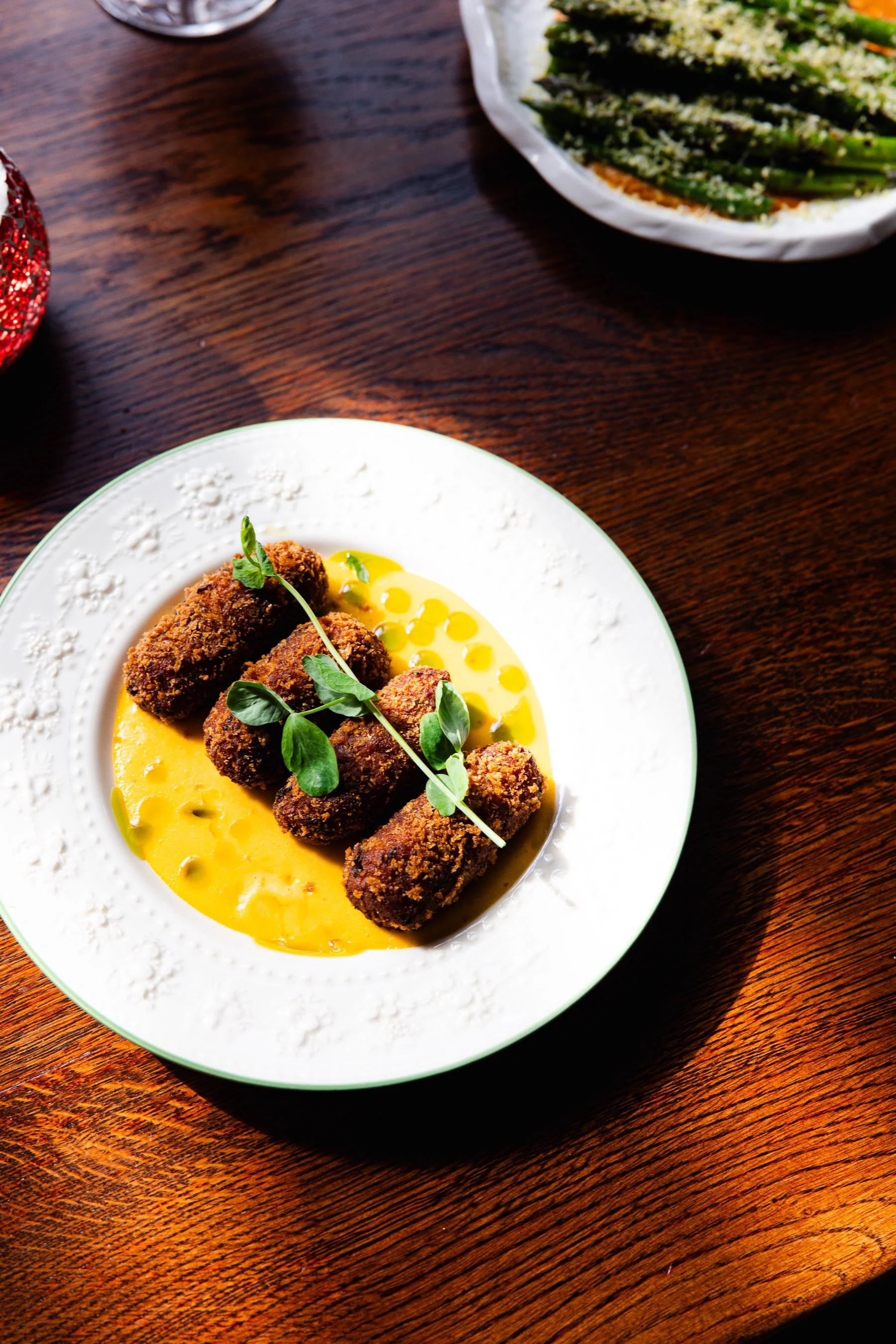 spiced squash, gouda, mint, mango & chili aioli, orange oil (V)